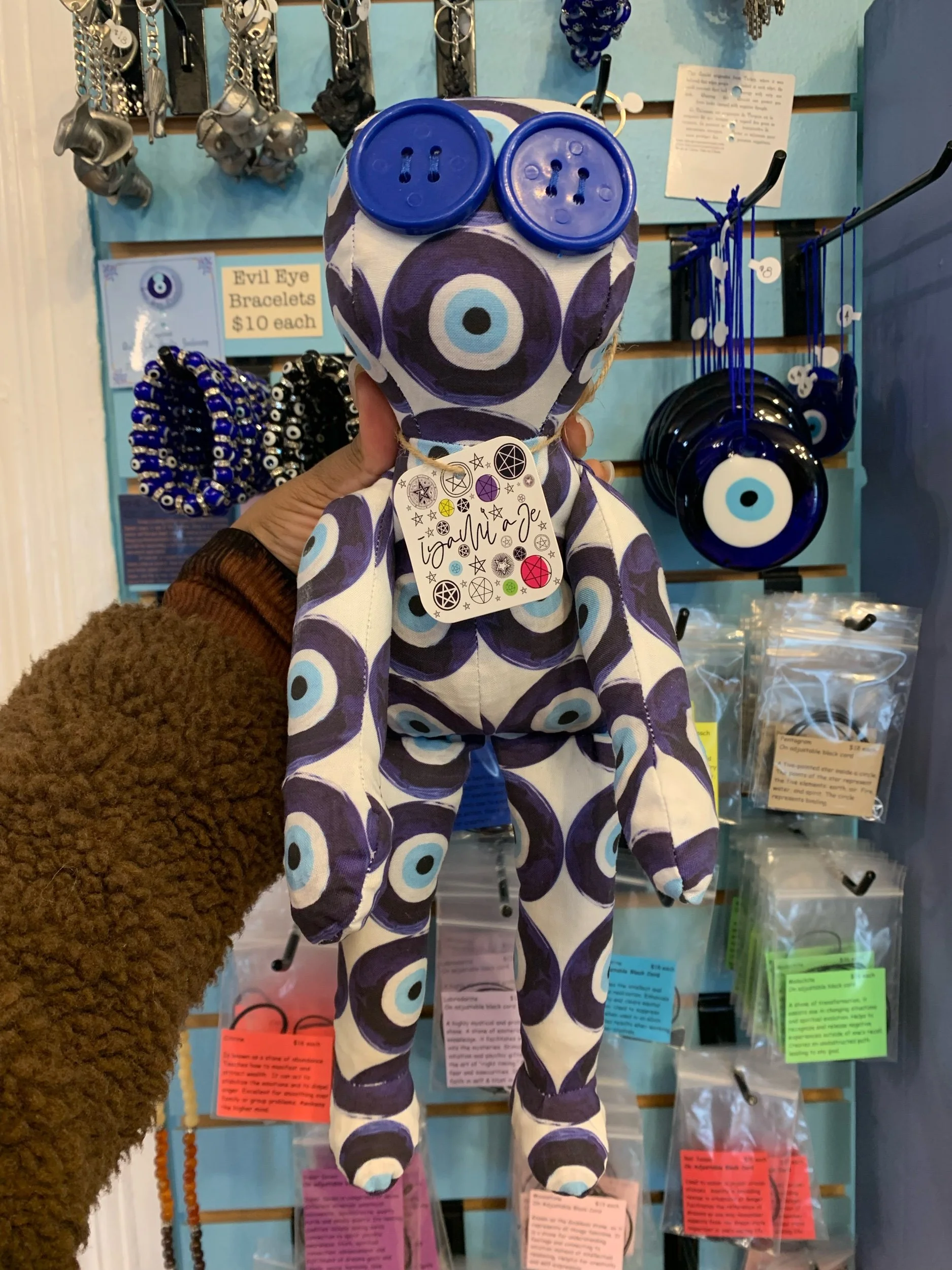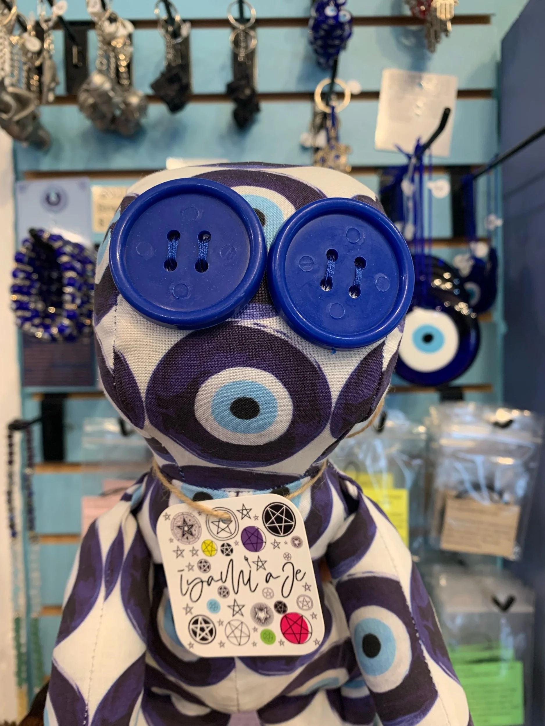 This Evil Eye Hoodoo Doll is a spirit of protection, reflection, and reversal. Wrapped in fabric covered with blue nazar eyes, it stands guard over your energy, your home, and your peace.