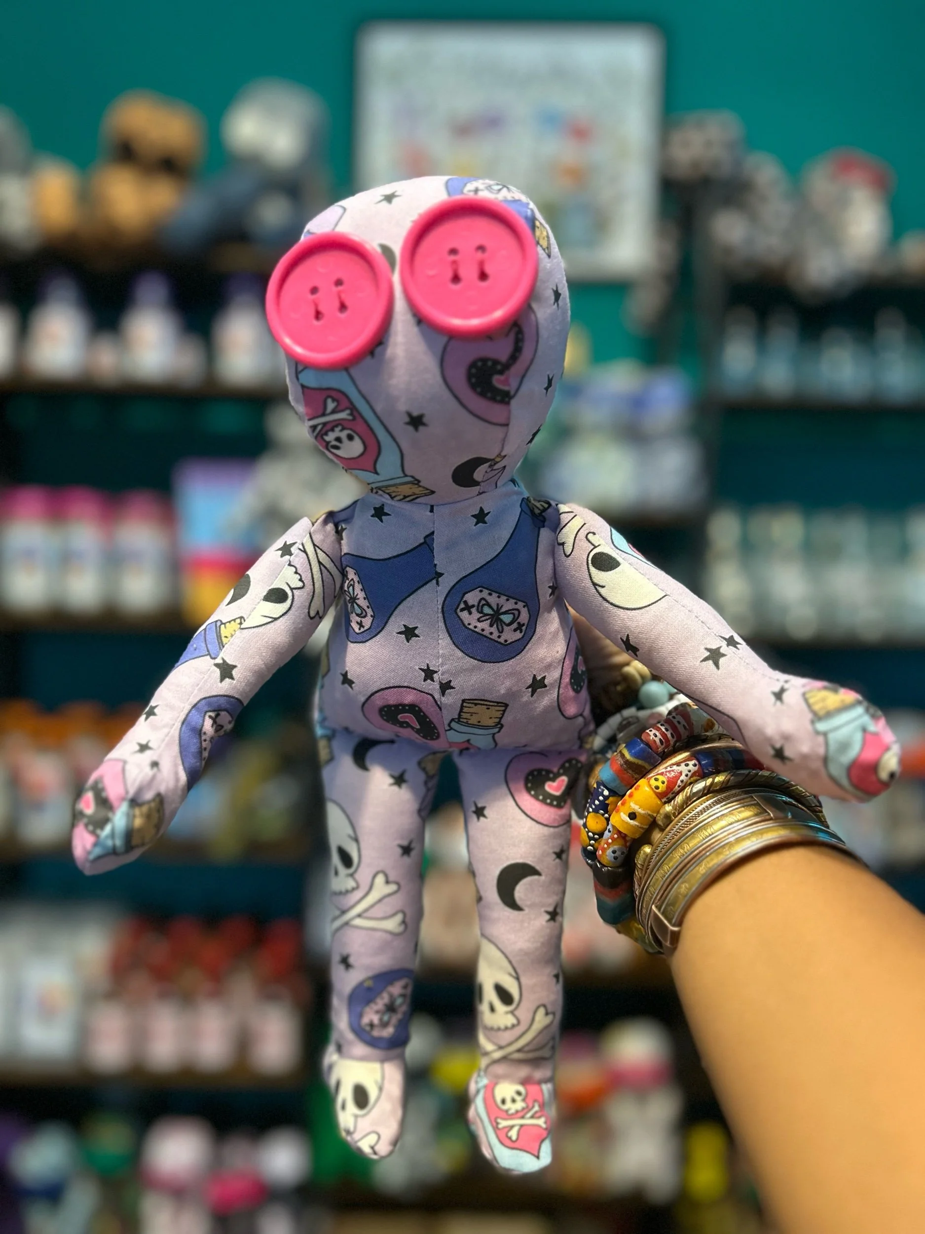 This Potion Hoodoo Doll is a conjurer’s companion — a spirit of alchemy, transformation, and ancestral medicine. Wrapped in deep purple fabric adorned with potion bottles, skulls, bones, and moons, this doll embodies the sacred art of mixing, healing, and transmutation. It carries the spirit of the rootworker, the herbalist, the conjure woman stirring her cauldron beneath the moonlight.