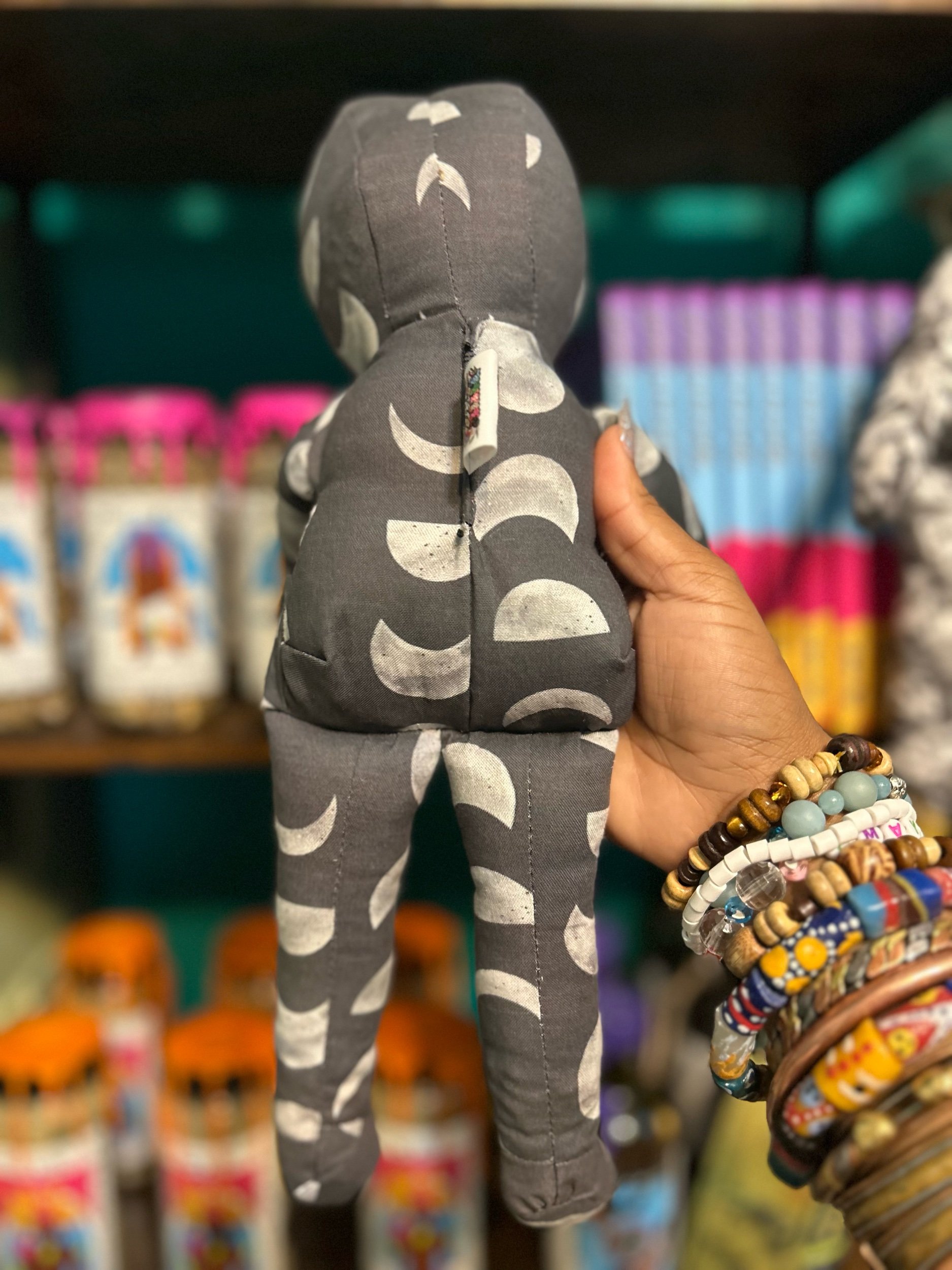 In Hoodoo, the moon governs all spiritual work — when to draw, when to release, when to rest, and when to rise. The old ones watched the sky to know when to plant, to pray, to cleanse, and to conjure. This doll carries that ancient knowing in her fabric and her spirit. She teaches balance — how to grow and let go in harmony with the tides, the body, and the ancestors.